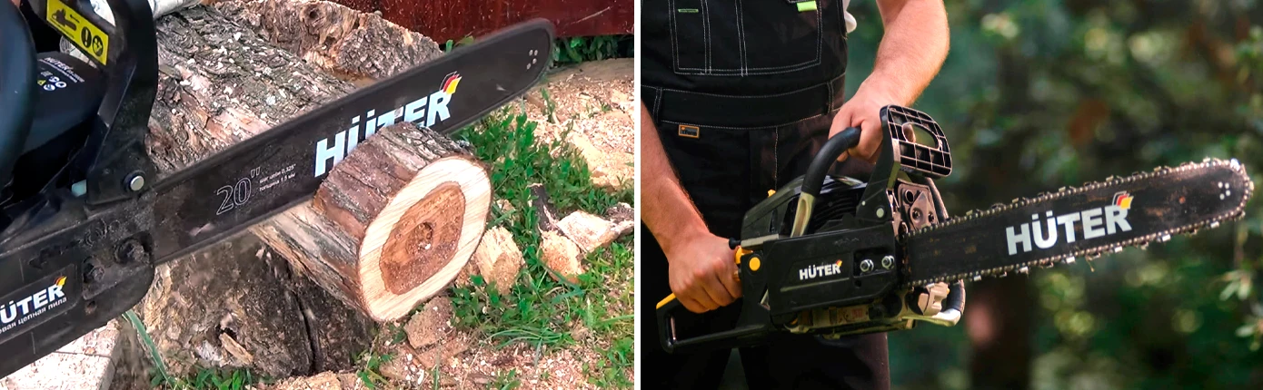 Благодаря длинным шинам цепные пилы справляются с толстыми бревнами, которые невозможно распилить дисковыми или сабельными пилами. Чем длиннее шина, тем мощнее и тяжелее инструмент, и труднее с ним работать.