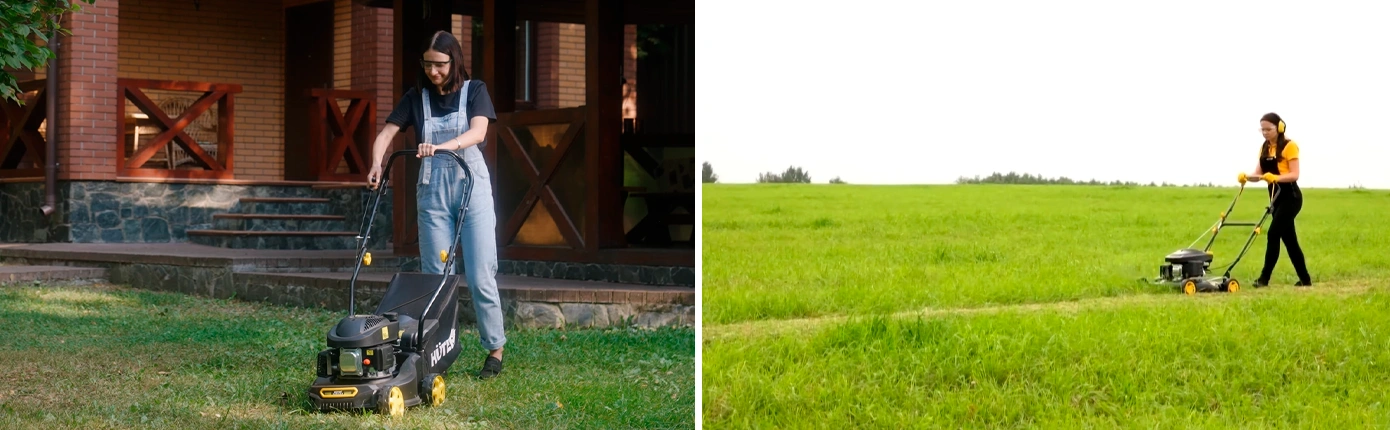 Для больших газонов разумнее выбрать бензиновую самоходную технику с широкой полосой захвата, мощным мотором и вместительным травосборником. Они ускорят процесс стрижки, а также сократят физические усилия.