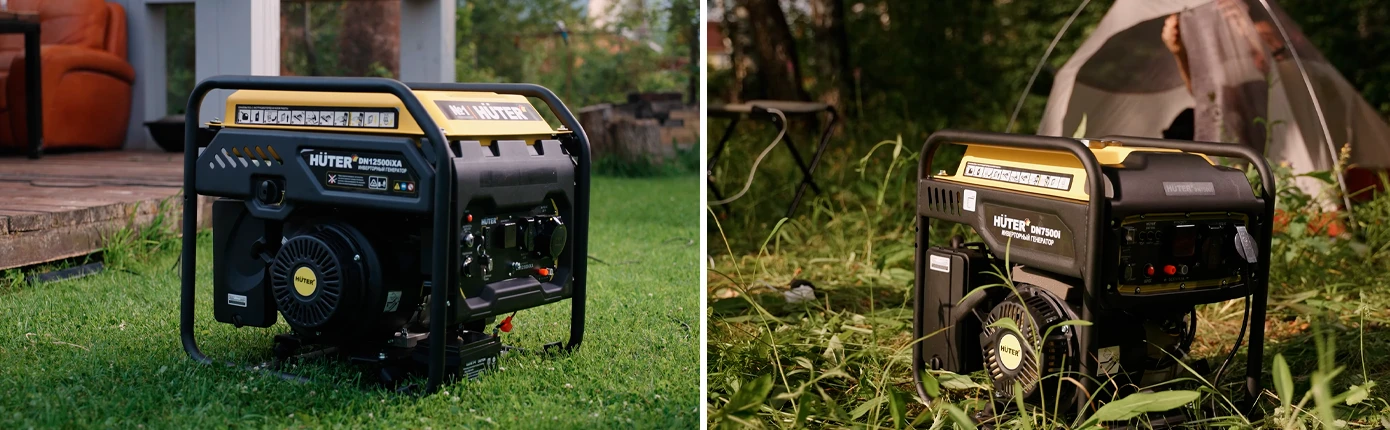 Для начала стоит определиться, на каком топливе будет работать ваш генератор. Этой теме у нас посвящена отдельная статья: «Виды генераторов и их назначение». В ней подробно разобраны плюсы и минусы бензиновых, дизельных и газовых портативных электростанций. Самыми востребованными и доступными для дома и дачи являются бензиновые генераторы. Они просты в эксплуатации, сравнительно компактны, подходят для кратковременного или нерегулярного использования, выезда на природу или резервного электроснабжения. О них и пойдет речь далее. Компания HUTER выпускает две серии бензогенераторов: DY — классические и DN — инверторные. Инверторные модели компактнее, работают тише, при этом выдают стабильное и качественное напряжение, безопасное даже для чувствительной электроники, но стоят дороже обычных бензиновых аналогов.