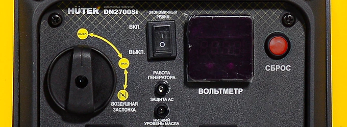 - Для подключения потребителей на лицевой панели генератора бензинового HUTER DN2700Si предусмотрено две розетки 220 В.