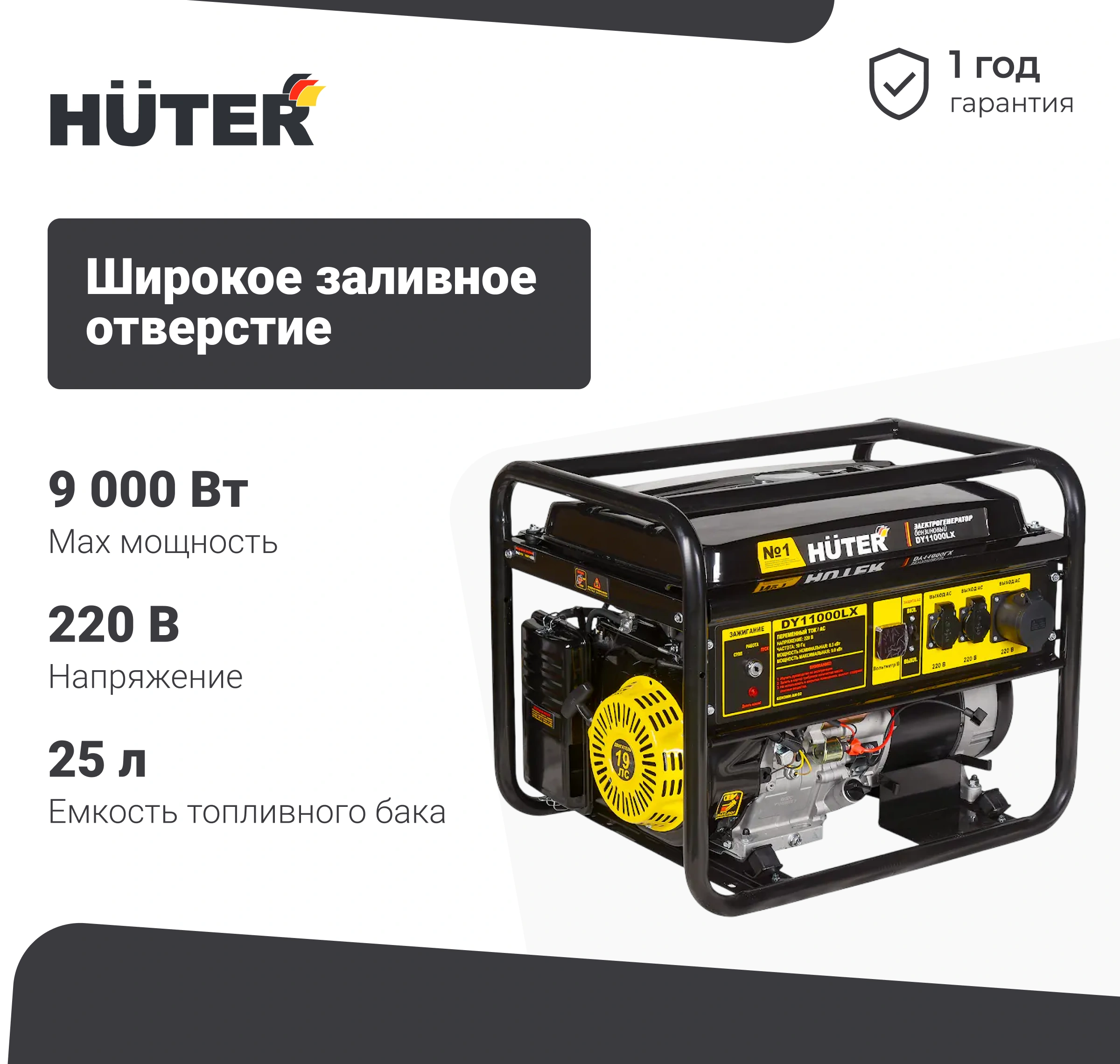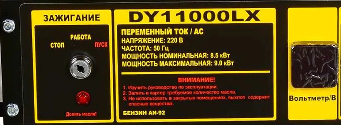 - HUTER DY11000LX защищен от запуска двигателя при низком уровне масла.