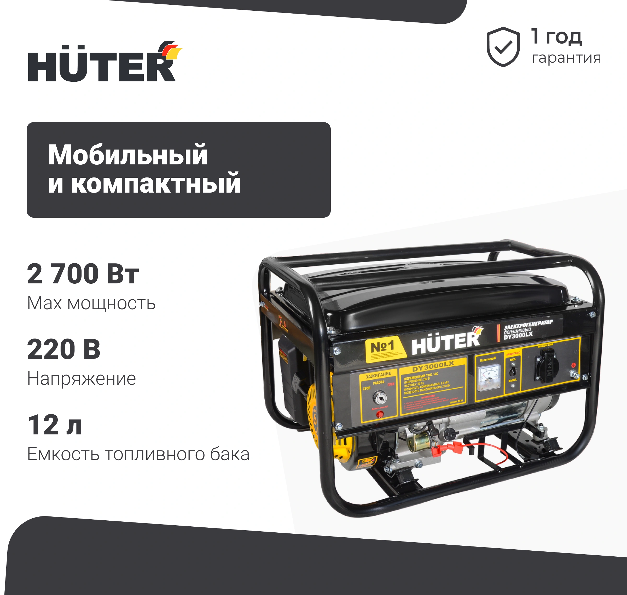 - Электрогенератор HUTER DY3000LX отличается низким расходом топлива: бака объемом 12 л хватит на 10 ч работы при полной нагрузке.