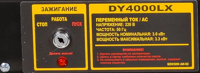 - Датчик уровня масла оснащен ламповым индикатором, предупреждающим о необходимости дозаправки. Медная обмотка альтернатора обеспечивает устойчивость электрогенератора HUTER DY4000LX к повышенным нагрузкам.