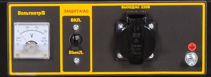 Аналоговый вольтметр показывает текущее выходное напряжение. Если в системе недостаточно моторного масла, на передней панели загорится лампа с надписью «Долить масло». Индикатор расхода топлива на бензобаке предупреждает о необходимости дозаправки. Быстросъемная крышка облегчает доступ к воздушному фильтру.