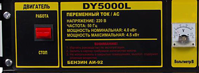 - HUTER DY5000L защищен от запуска двигателя при низком уровне масла.