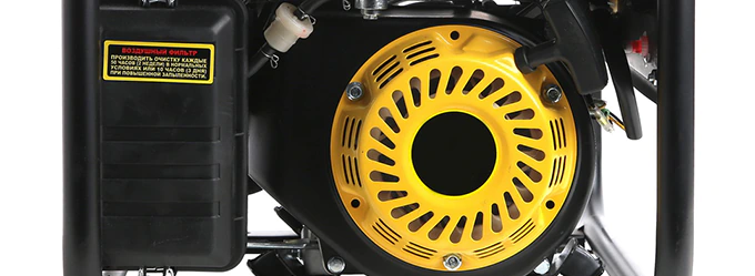 Бензогенератор оснащен четырехтактным двигателем мощностью 11 л.с., который отличается высокой надежностью. Верхнее расположение клапанов (OHV) способствует лучшему охлаждению и долговечности мотора. Воздушное охлаждение обеспечивает стабильность работы.