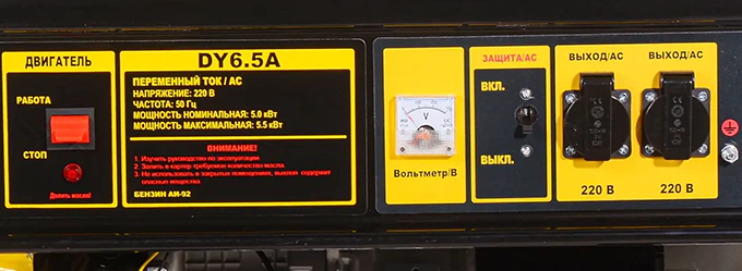- Система стабилизации поддерживает номинальное напряжение на выходе генератора HUTER DY6.5A независимо от изменений в нагрузке.