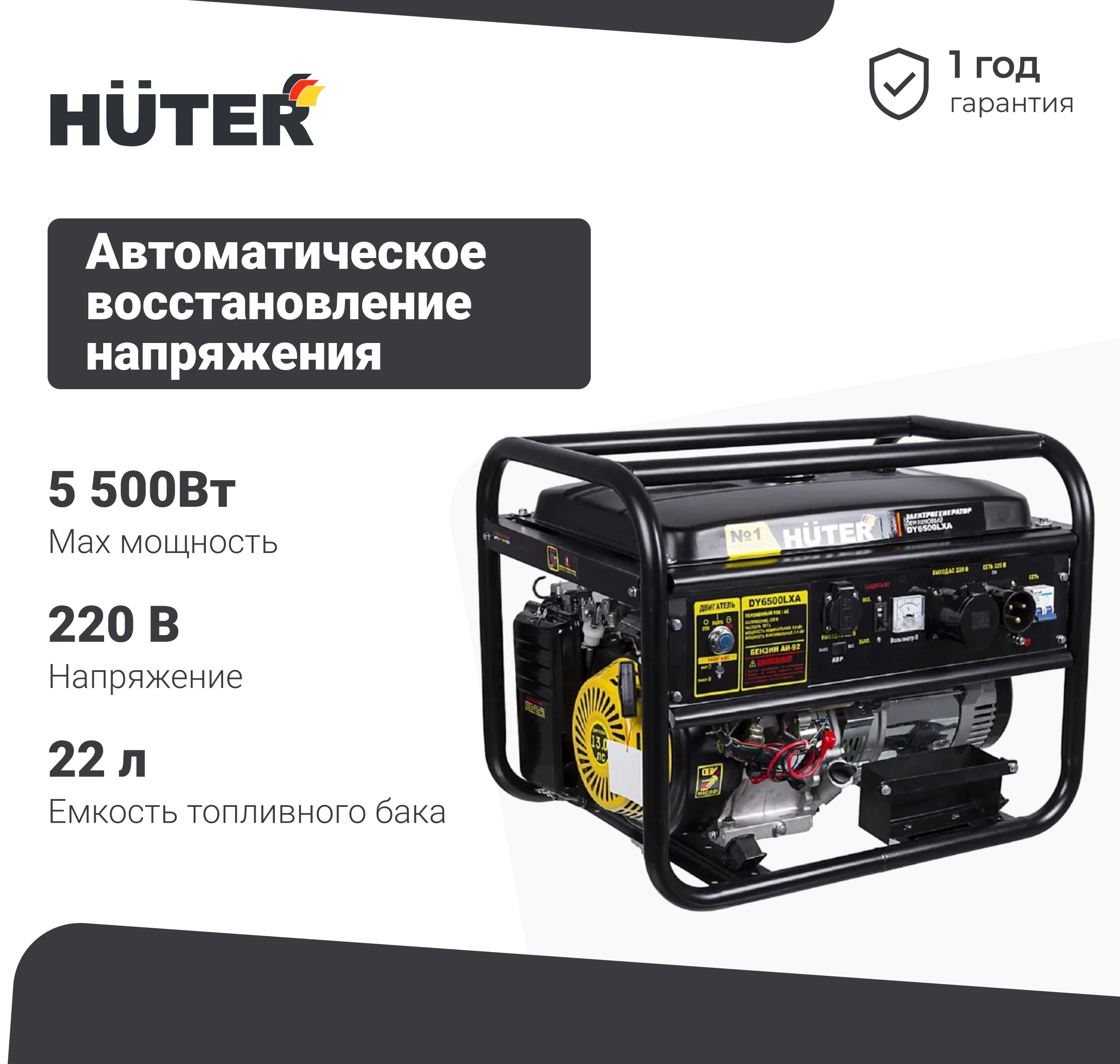 - HUTER DY6500LXA оснащен бензобаком объемом 22 л. Полной заправки достаточно на 8 ч работы при стопроцентной нагрузке.