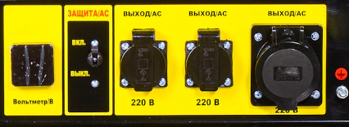 Помимо двух бытовых розеток на 16 А передняя панель оборудована силовой однофазной розеткой на 32 А для питания мощного электрооборудования. Все три розетки имеют крышки для защиты от влаги и пыли. Это немаловажно при эксплуатации генератора на улице или в условиях стройплощадки.