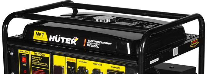 - HUTER DY9500L оснащен синхронным альтернатором с медной обмоткой, за счет чего устойчив к большим нагрузкам и перегреву.