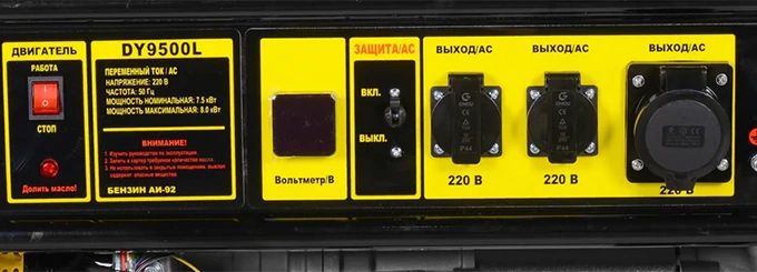 Панель управления HUTER DY9500L интуитивно понятна и проста в использовании. На ней расположены индикаторы для контроля работы электростанции. Наличие вольтметра позволяет отслеживать текущее напряжение, обеспечивая стабильное электроснабжение ваших устройств.