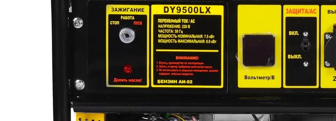 Бензиновый генератор HUTER DY9500LX поможет в случае отключения основного питания избежать простоев в работе электрооборудования или обеспечить автономное питание небольшого частного дома. К трем однофазным розеткам с напряжением 220 В и силой тока 16 А и 32 А можно подключать строительные инструменты, бытовую технику и прочие электрические устройства, потребляющие в совокупности 7,5 кВт. Вольтметр на передней панели показывает текущее выходное напряжение. Четырехтактный двигатель мощностью 13 л.с. заводится с помощью электрического или ручного стартера. Электрогенератор HUTER DY9500LX имеет систему комплексной защиты от короткого замыкания, низкого уровня моторного масла и перегрузки.