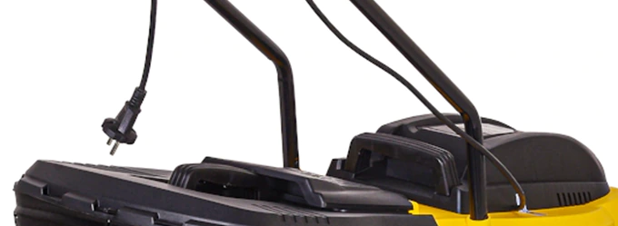 Чтобы приступить к работе, достаточно вставить вилку в розетку и прижать к рукоятке приводной рычаг, который находится под правой рукой. Колеса плавно катятся по газону, не оставляя глубоких следов. Держатель кабеля на рукоятке предотвращает случайное отсоединение от сети.