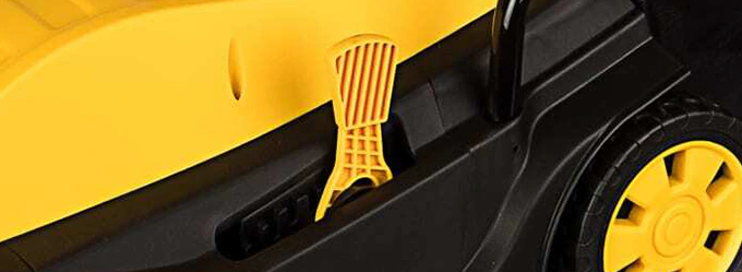 Настройка высоты среза травы выполняется за считанные секунды. Достаточно переставить рычаг на корпусе в одно из пяти положений в диапазоне 28–55 мм. Дека с ножом опустится или поднимется на необходимый уровень над землей.