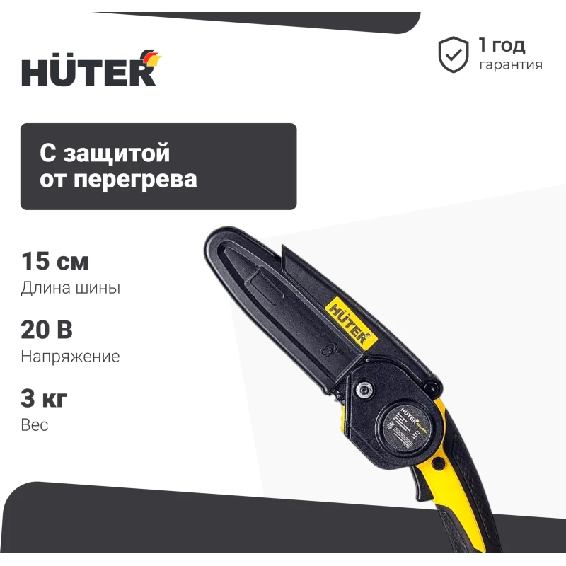 - Наличие двух аккумуляторов в комплекте обеспечивает продолжительную непрерывную работу цепной пилы HUTER ELS 2 Li 6K.