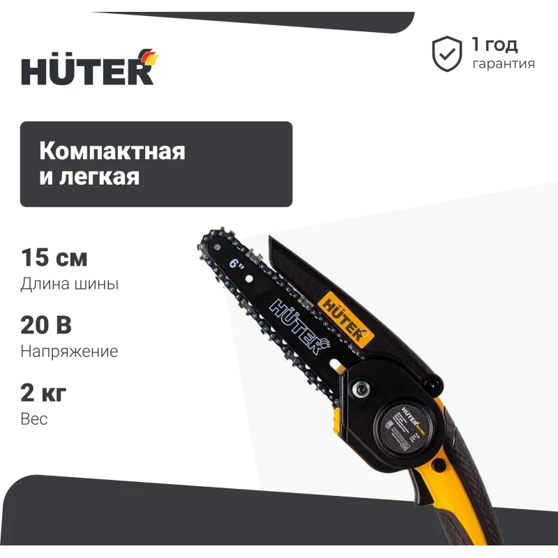 - В комплект входит аккумулятор напряжением 20 В. Вы можете сразу приступить к работе с электропилой аккумуляторной HUTER ELS 20Li.
