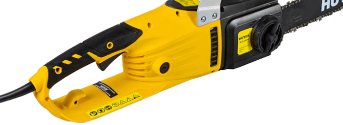 Для безопасности предусмотрены инерционный тормоз цепи и защитный щиток. Кнопка блокировки случайного включения предотвращает непреднамеренный запуск.