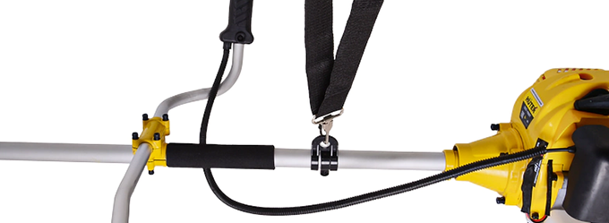 Антивибрационная система снижает нагрузку на руки оператора. Наплечный ремень облегчает переноску инструмента. В целях безопасности широкий защитный кожух закрывает вращающуюся насадку. Сквозь полупрозрачные стенки бака удобно отслеживать уровень оставшегося топлива.