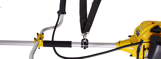 Рукоятка велосипедного типа — залог эффективности и комфорта. Регулируйте ее под себя, делайте размашистые движения как при работе обычной ручной косой. Все кнопки управления удобно расположены на правой ручке. Плечевой ремень равномерно распределяет нагрузку. Система гашения вибраций делает работу с мотокосой более комфортной.