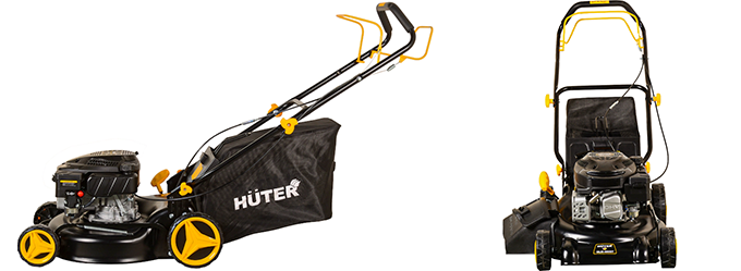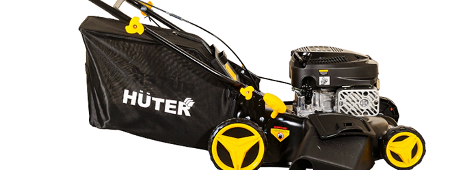 Бензиновая газонокосилка HUTER легко заводится с помощью ручного стартера. Управление осуществляется с помощью двух прижимных рычагов, которые расположены на рулевой рукоятке. Один из них отвечает за привод колес, а другой включает вращение ножа.