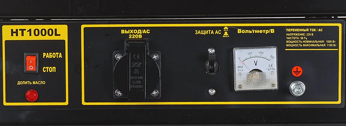 - Вольтметр со стрелочной шкалой показывает величину напряжения переменного тока, подаваемого портативным бензогенератором HUTER HT1000L на розетку.