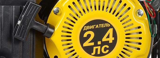 - 4-тактный двигатель мощностью 2,4 л.с., оснащенный ручным стартером.