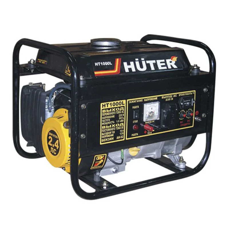 Бензиновый генератор HUTER HT1000L представляет собой компактную переносную электростанцию с одной розеткой переменного тока 16 А/220 В. Генератор пригодится для автономного питания электроприборов номинальной мощностью 1 кВт в гараже, на стройке или даче. Четырехтактный двигатель имеет электронный выключатель зажигания и заводится с помощью ручного стартера. Электрогенератор оборудован системой стабилизации напряжения и автоматами защиты, отключающими нагрузку в случае короткого замыкания или перегрузки.