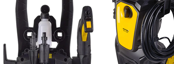 Мойка HUTER M-3-1650 весит всего 7 кг и имеет компактный корпус. Благодаря колесикам и ручке ее легко перемещать по участку. 5-метровый шланг обеспечивает достаточную свободу действий даже при мытье габаритных объектов: автомобилей, фасадов, заборов и т.п.