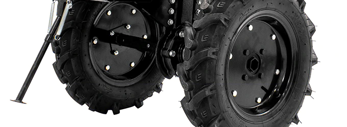 Бензиновый мотоблок HUTER оснащен большими пневматическими колесами с рельефным протектором, имеющими хорошую проходимость. Две скорости движения вперед позволяют выбрать оптимальный режим обработки в зависимости от состояния почвы. Режим заднего хода облегчает высвобождение фрез, увязших в грунте.