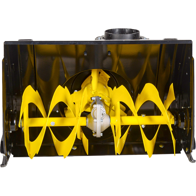 Конструкция насадки состоит из снегоуборочного ковша с металлическим шнеком и желобом для выброса снега. На желобе есть ручка регулировки направления и высоты выброса снега.