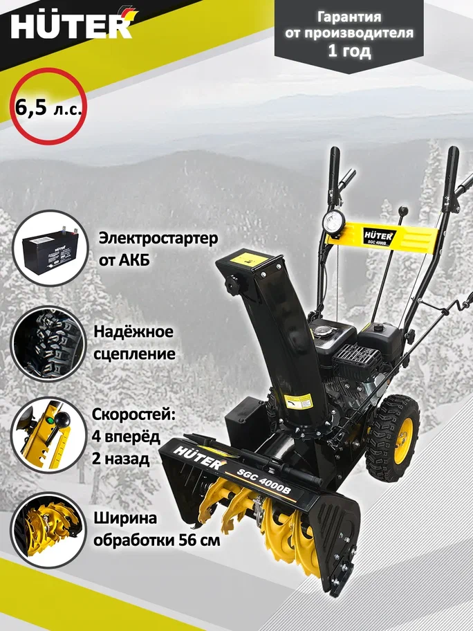 Бензиновый снегоуборщик HUTER SGC 4000B — надежный зимний помощник для владельцев частных домов и дач. С ним вы быстро очистите от снега двор, дорожки, парковку, подъездные пути и другие территории. Четырехтактный двигатель мощностью 7 л.с. легко заводится с помощью электростартера, работающего от аккумулятора напряжением 12 В. Праймер для подкачки топлива в карбюратор упрощает запуск холодного мотора.