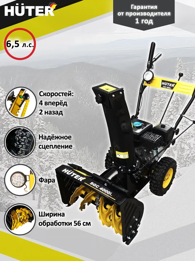 Бензиновый снегоуборщик HUTER SGC 4000L мощностью 7 л.с. облегчает и ускоряет очистку территории около дома, парковочных мест, дорожек и других объектов от снега. Праймер для подкачки топлива в карбюратор упрощает запуск четырехтактного двигателя.