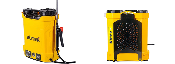 Опрыскиватель HUTER SP 10AC используется для распыления жидких удобрений, пестицидов, фунгицидов, гербицидов и других химических растворов. Для удобства переноски 10-литровый бак оборудован «спинкой» и широкими наплечными лямками. Прибор работает от аккумулятора емкостью 8 Ач. Встроенный насос обеспечивает необходимое давление. Чтобы начать распыление, достаточно установить батарею, заправить бак и нажать рычаг на рукоятке. В комплект поставки включены три сменные насадки, позволяющие регулировать форму струи.