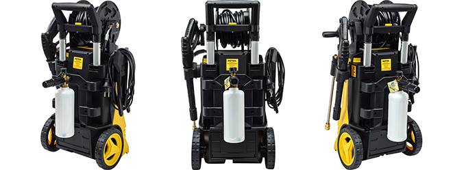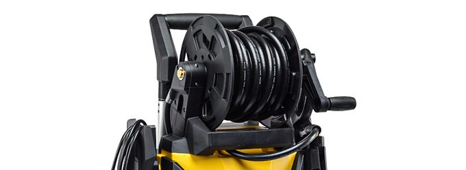 В конструкции предусмотрен барабан для намотки шланга, держатели для 5-метрового кабеля, моечного пистолета и сменных форсунок. Мойка не занимает много места, а необходимые в работе принадлежности всегда находятся под рукой.